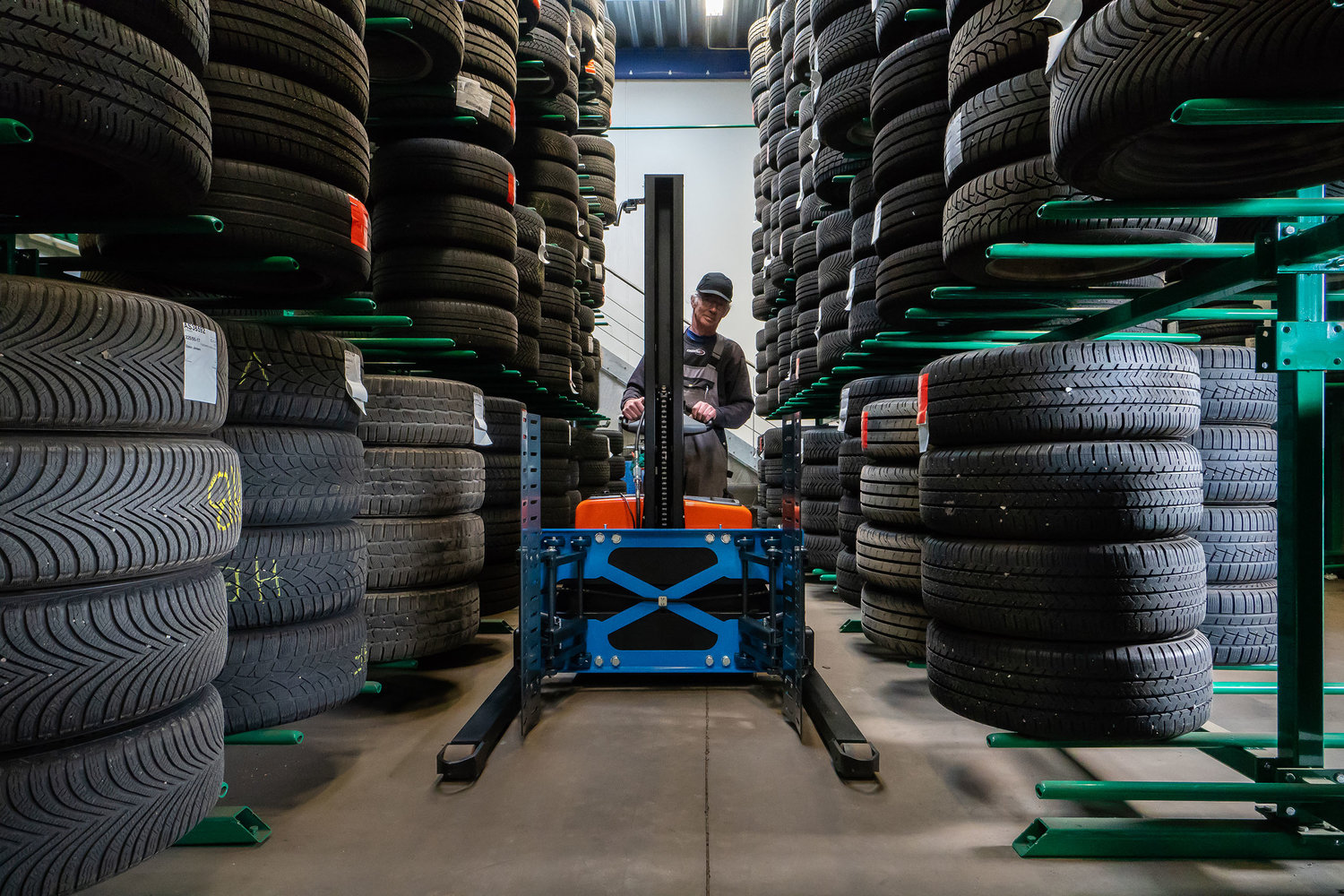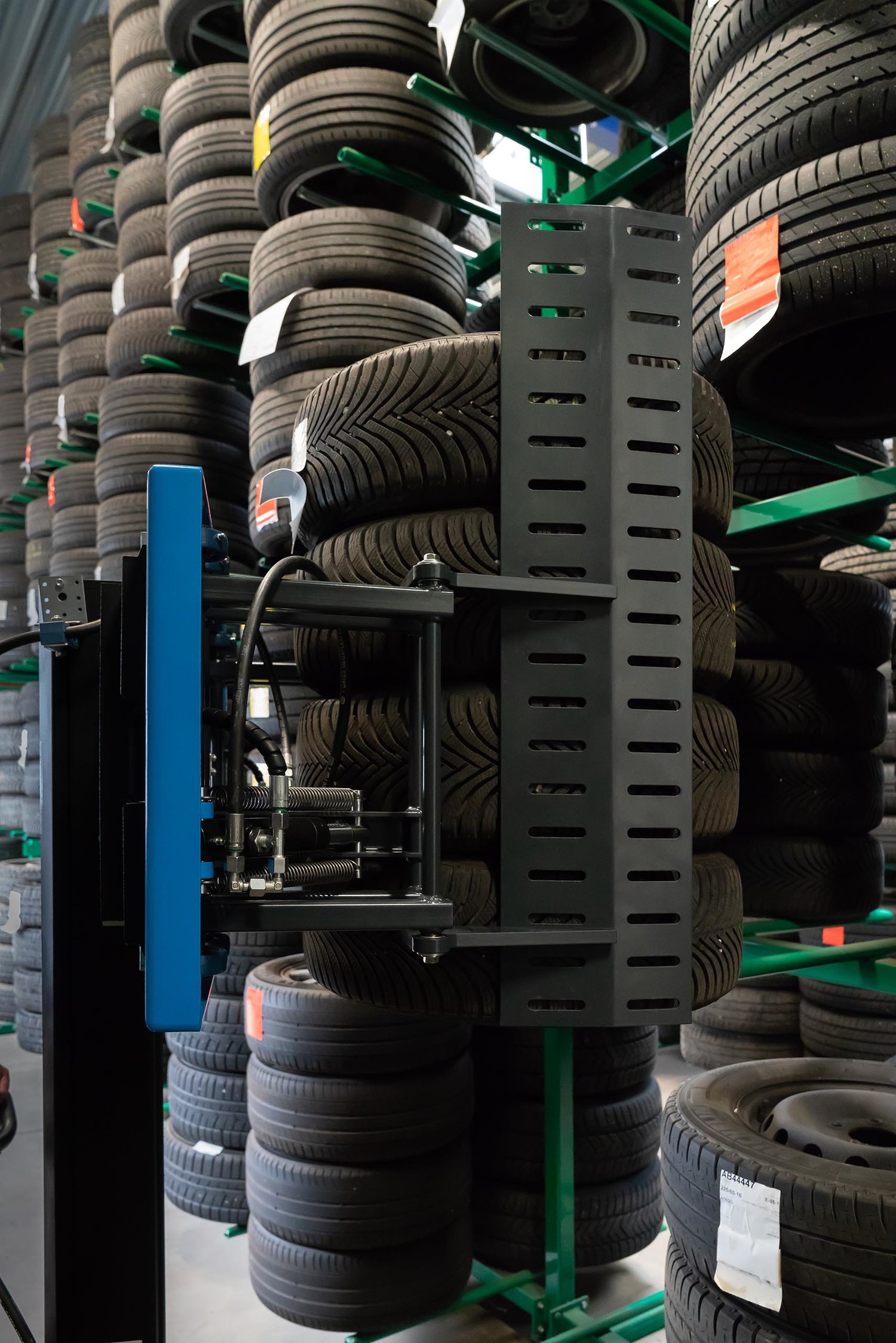 Med Däckklämman Easy Stacker 800 plockas däcksatsen direkt från pall eller golv och placeras på lagerhyllan.